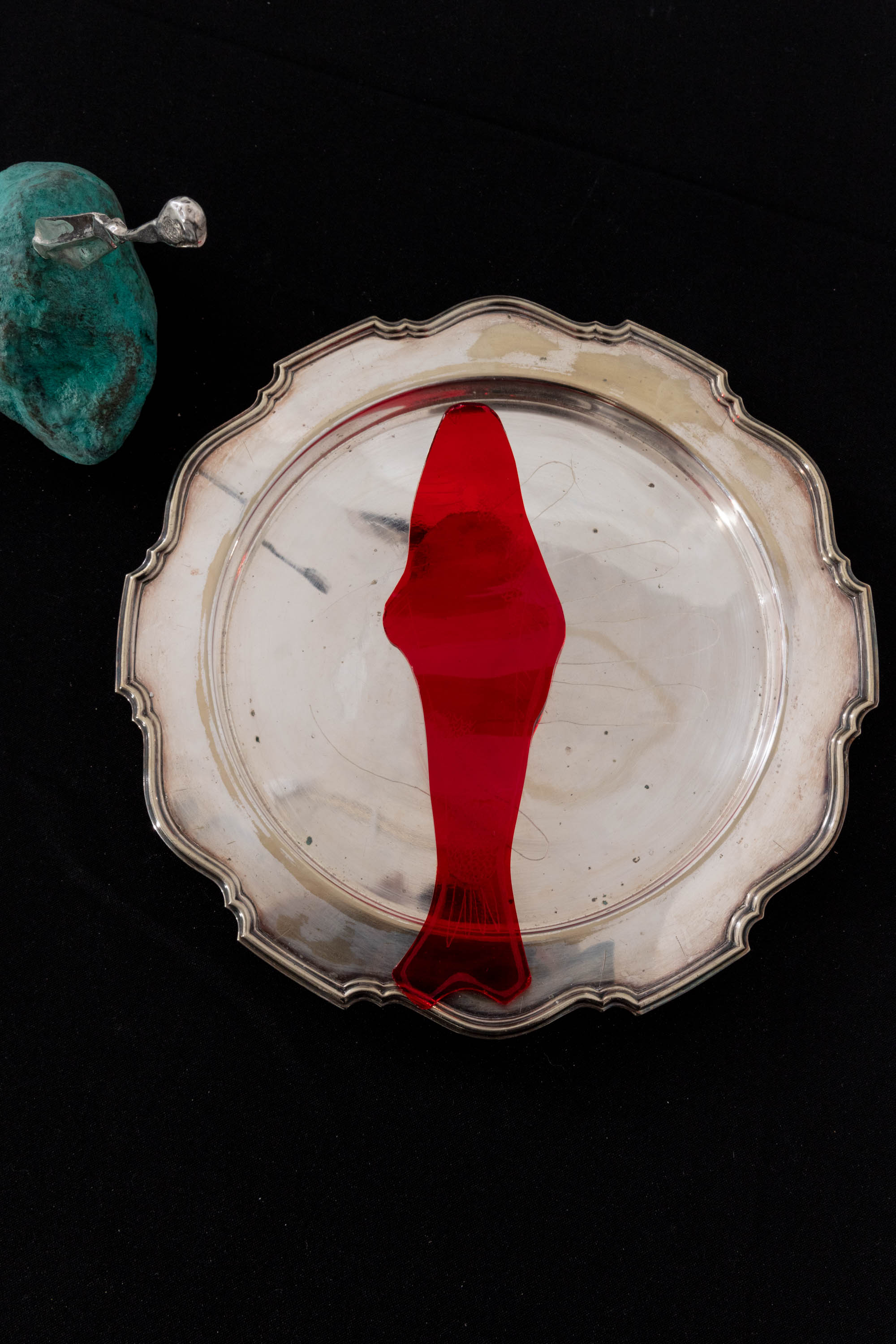 Paired alongside a glass fortune telling fish, slumped by hand in-kiln at 650c ontop of a bed of artist’s palm engraved antique silver plated dish.